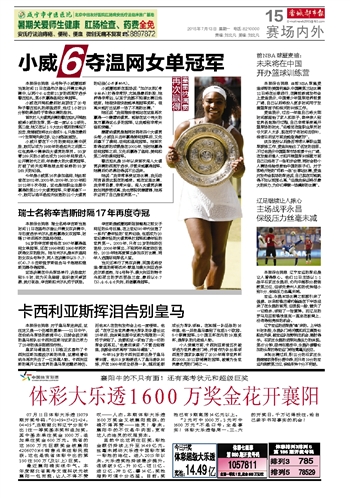 本报综合消息 头号种子小威廉姆斯当地时间11日在温布尔登公开赛女单决赛中,以两个6:4击败21岁的西班牙选手穆古拉扎,第6次赢得温网女单冠军。
