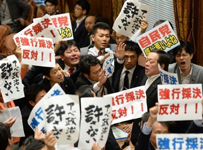 经过累计110多个小时的审议,众议院和平安全法制特别委员会当天就安倍政府提交的安保法案进行总结性答辩。在主要反对党代表质询结束后,执政的自民党和公明党控制的特别委员会不顾在野党强烈反对进行表决,并通过了安保法案。众多反对党议员在会场打出“反对强行表决”、“打倒安倍政治”、“自民党真差劲”等标语,抗议执政党无视民意强行表决“战争法案”。