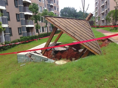 24日,温泉三江航天花园的业主报料称,小区公共绿化带发生塌陷。记者在该小区42栋后面的绿化带看到,一块约9平方米的绿化带塌陷,形成一个深坑,造成一座休闲亭垮塌(如图),事发现场已被拉上警戒线,所幸未造成人员受伤。据小区物业员工介绍,事故原因可能和近期频繁下雨有关,目前,他们正在筹备维修。 方达星/摄