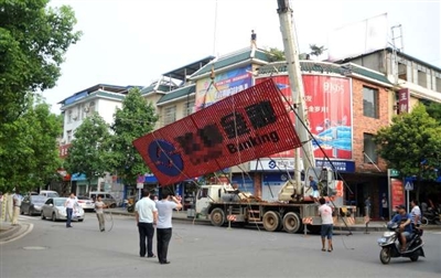近日,市城管一大队在市区淦河大道、银泉大道、南外环等路段拆除了一批设置不规范、破旧损毁的违规户外广告牌。据介绍,今年6月份以来,该大队共依法拆除违规户外广告牌4000多平方米。方达星郑世明/摄