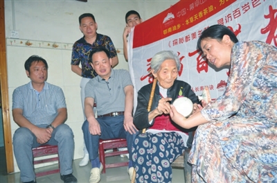 近日,通城县副县长喻玉平、大坪乡党委副书记、乡长吴红艳、湖北药姑山生态产品有限公司董事长李华良及当地多名企业家来到该县大坪乡来苏村2组,为当地百岁老人胡耀保送去生日祝福和关爱。