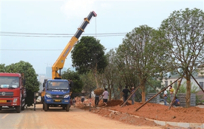 市区龙潭大道改造工程施工现场道路两旁开始种植桂花树