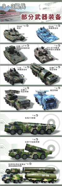 同时,也有一些全新面孔,像海军的新型反舰导弹、新型舰空导弹、新型舰载机等,空军的新型战斗机、新型远程轰炸机、新型预警指挥机等,陆军的新型武装直升机、新型改进型主战坦克等,第二炮兵的新型中远程常规弹道导弹、改进型战略弹道导弹等。