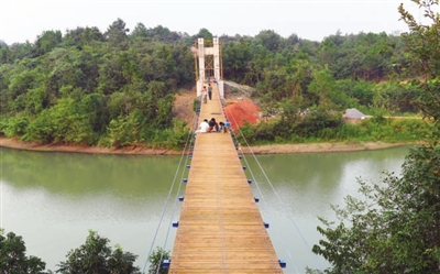 近日,记者在第十届中国(武汉)园博会咸宁园看到,园区内的绿化工程基本完成,目前各景点建设正在进行最后的冲刺。图为园区内的一座吊桥正在进行最后的完善施工。赵忠志/摄
