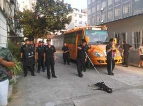 31日下午17时许,通山县公安局巡警大队值班民警接报案后,立即带领特勤队员携带钢叉、警棍、盾牌等装备迅速赶至通羊四小预备处置。