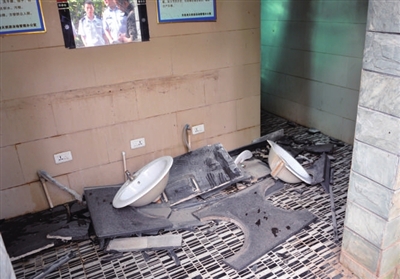 据聂师傅介绍,前一天洗手台还是好好的,昨日早上他过来做清洁时发现洗手台整个掉在地上,摔得四分五裂,已无法使用。聂师傅说,公厕里的灯具和垃圾桶也不时遭到破坏,希望市民爱护公共设施。 (方达星/摄)