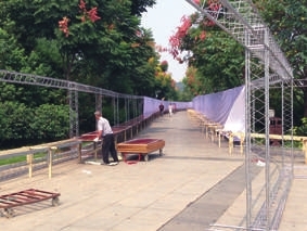昨日上午,记者在十六潭公园看到,工人正在加紧施工作业,为即将举行的中三角(咸宁、岳阳、九江)第二届盆景、赏石、根艺活动搭台布展。