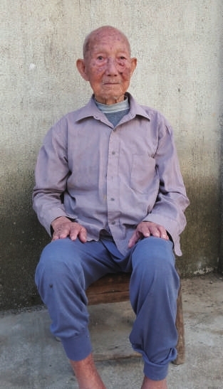 记者近日来到咸安区高桥镇洪港村四组,在村人热情的指引下,很顺利地见到了郑美城老人,老人1914年7月出生,当时正坐在门口,看服侍他的女儿郑勤芝扫地。