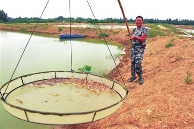 来到对虾养殖基地,40多口鱼塘连成的400亩水面整齐镶嵌在田野里,对虾老板杨巍正在使劲收网。阳光下,好一幅虾蹦人欢的丰收画面。