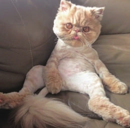 这只猫的外形酷似热播动画片《加菲猫》里的主角。图片中,它时常坐立在沙发上,舌头微微伸出,眼睛迷离地瞪着主人,萌萌的样子把众多网友的心都融化了。(来源:新浪微博)
