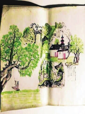 大爷说,“我搞不懂啥子技术,我就是照着画嘛,粗细、浓淡那些我也没有研究过,完全是靠感觉和我心目中对那个东西的印象。”陈大爷显示出一种可爱的诚恳与认真的稚朴。他画古榕树,古树下面有一叶竹筏,一个撑筏的老人戴个斗笠,竹筏前头立个姑娘,若有所思。他画个田园,近景是一个农民赶着牛耕田,牛儿奋勇前进,后面有两只鹅,像赶着这个春,生动极了。