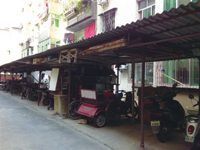 接到投诉后,记者来到该小区,只见在小区停车亭内,堆满了三轮车、自行车、破旧家具、废纸箱等各种废旧物品。记者发现,有的三轮车轮子已经少了一只,不少自行车的铁架也已经烂得不成样子,根本无法继续使用。