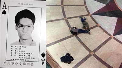 去年12月4日晚,一名男子在广州市荔湾广场跳楼企图自杀,却砸死路人。跳楼男子被救活后,被发现竟然是射伤警察后逃亡17年的悍匪、公安部B级通缉犯“黑桃A”——林锦成。10月12日,林锦成在广州中院受审,检方指控其犯抢劫罪、故意伤害罪、抢夺枪支罪和过失致人死亡罪4项罪名。