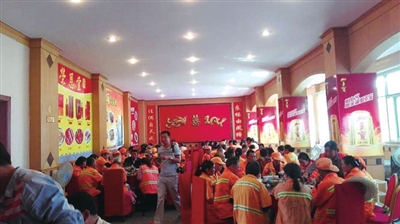席间,老板邱建来不停地叫服务员添汤加菜,看着环卫工人吃得热闹开心,老板邱建来心里也乐开了花。