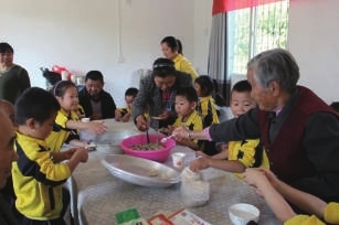 当日上午9时许,活动隆重举行。首先由老师带领幼儿为老人们送上点心和水果,幼儿还主动扶着行动不便的老人落座,与他们亲切交谈,一声声“爷爷、奶奶”让老人们感到无比的激动和温馨。随后,全体师幼和和老人们一起包饺子,孩子们在老师的帮助下,独立包好了一个又一个饺子,在动手操作中获得了更多的快乐体验,在潜移默化中传承着中华美德。最后,孩子们还为爷爷奶奶表演了丰富多彩的节目,一时间,整个福利院内回荡着孩子们的歌声、老人们开怀的笑声和掌声,为平素安静的福利院带来了欢乐热闹的气氛。