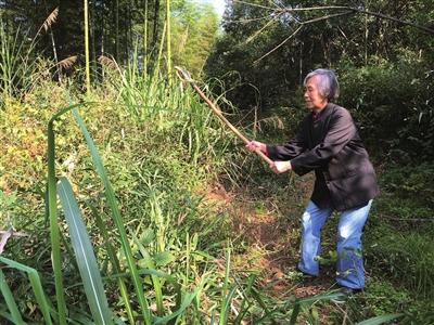 忙完家里的事情,刘舒珍老人再次扛着自制长把镰刀,时隔一周后再次来到赤壁中伙铺泉洪村成家山。只见她步伐矫健,上山下坡毫不费力,边走边用镰刀除草,并为楠竹施肥。