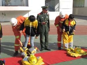 当天上午九时许,随着一声急促的警报铃响,同学们迅速用毛巾捂住嘴巴,弯腰有序的从教室出来。两人一排靠右依次下楼,班主任和搭班老师一前一后陪护在队伍左右,各个楼梯弯道都有老师值守,同学们顺利到达操场集中,整个耗时2分30秒,达到了预期的目标。随后为了加强对消防知识的掌握,特勤中队的战士们教大家怎样拨打火警电话;与学生模拟场景演练;教老师处置煤气罐着火等。