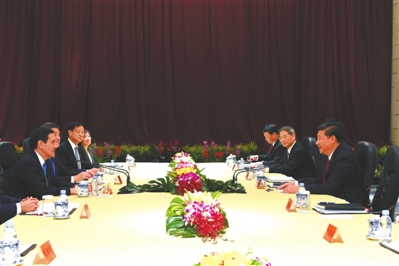 在长达80秒的握手后,习近平、马英九并肩步入举行会面的会场,就进一步推进两岸关系和平发展交换意见。