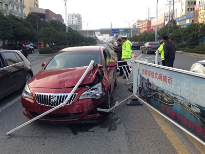 据红色轿车内一女子介绍,当时司机大意,意外撞到护栏,还好人没事。