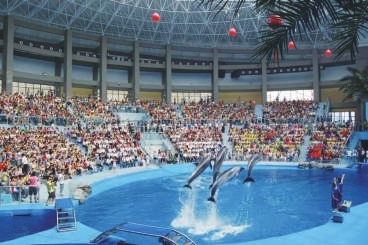 来到内场,正好赶上海洋馆表演:海鲸在驯养师的指挥下唱歌,歌声悠扬;海狮单柱顶球,旋转360度,技术高超啊;三只海豚齐腾跃,人豚共舞!观看台上,孩子们兴奋不已,鼓掌阵阵!