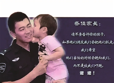广州市公安局吴警官表示,提示海报最早是由英国杜伦警方推出的,呼吁家长们不要拿警察吓唬不听话的小孩。