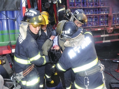 事发现场,一辆江西牌的蓝色货车追尾了前方黄色器材货车后,另一辆满载生禽的湖南牌货车来不及制动,直接撞在了江西牌货车上。二次受冲撞的江西牌货车被“夹扁”在两辆货车之间,驾驶员双脚被卡在车内无法动弹。而且货车油箱发生了漏油情况,随时有爆炸的可能。追尾的湖南牌货车驾驶室严重变形,司机被困,左腿被压断,头上鲜血直流。