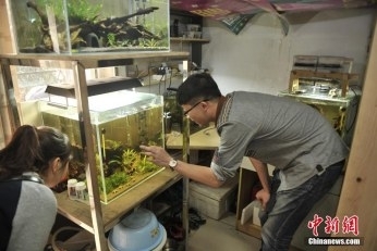 重庆大学研究生正在为养在寝室的鱼喂食、清理残渣。重庆大学一研究生奇思妙想在校园宿舍用5个水族箱养了近70条五颜六色的热带鱼,种类多达十几个,把宿舍变成了水族馆,现已经成了校园里知名度颇高的“养鱼大户”。 (中新网)