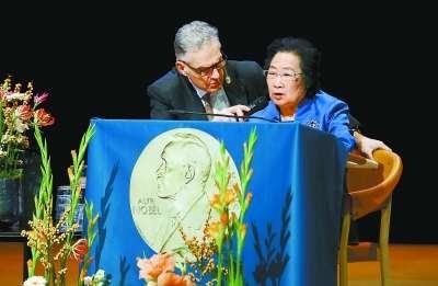 身着宝蓝色套裙的屠呦呦和另两位该奖得主大村智及威廉·坎贝尔缓缓步入礼堂,一同就座。在大村智和坎贝尔分别演讲后,屠呦呦用中文开始了主题演讲《青蒿素——传统中医给世界的一份礼物》。