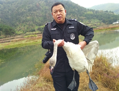 当日,九宫山自然保护区森林公安分局就接到船埠村村民报警称,在船埠村龙虾养殖池发现一只疑似天鹅的飞禽,民警立即赶赴现场,仔细检查后发现“白天鹅”右翅下窝处受了伤。民警对事件经过作了详细了解,将这只“白天鹅”进行了简单伤口处理,当天下午移送到湖北省野生动物救助中心救治。