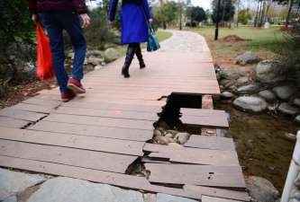 本报讯(记者张仰强)昨日,市民王女士向本报反映,在市人民广场散步时,走过一处连接小溪的栈道,栈道破损让他差点摔了下去,“老人小孩从这儿过,很是危险。”王女士担心地说道。