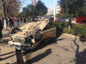 本报讯 (记者方达星)16日下午1时30分许,市区银泉大道元信购物广场前,一辆小轿车与一辆出租车发生交通事故,小轿车“飞过”绿化带,四脚朝天躺在非机动车道上,受损严重,后被救援车吊起拖走。
