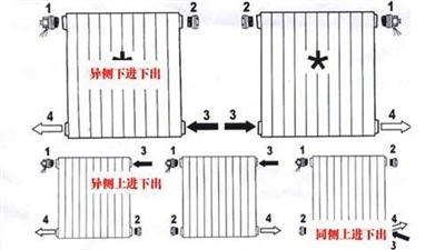 接管方式:散热器的接管方式有多种,常用的接管方式有:1—排气阀;2—盖子;3—进水口;4—出水口; ——建议应用。