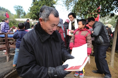 “羊年六畜兴旺五谷丰登,猴年九州欢歌四化辉煌。”在春联派送台,一位村民拿着一幅书法家刚刚写好的春联,笑得格外灿烂。