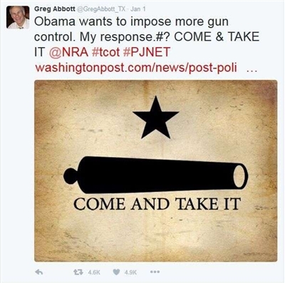 美国总统奥巴马在控枪问题上一直频繁“吃瘪”,由于反对者众多而无法通过控枪法案。在任期最后一年,奥巴马决定奋发,要越过国会,在新的一年以采取行政命令的方式限制枪枝暴力。公开持枪的得州立即反呛。得州州长艾伯特1月3日向奥巴马发出挑战,他在推特上贴出大炮图案,扬言奥巴马“有胆来拿”,到得州亲自收缴枪枝。