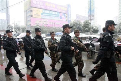21日,市公安特警队员们坚守岗位,在城区主要道路开展24小时武装徒步巡逻。 张恒/摄