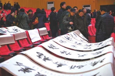 23日下午3时许,记者来到义卖会现场时,107幅装裱好的字画已整齐地摆放好,不少人正在围着选购。