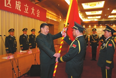 2月1日,中国人民解放军战区成立大会在北京八一大楼隆重举行。中共中央总书记、国家主席、中央军委主席习近平向东部战区、南部战区、西部战区、北部战区、中部战区授予军旗并发布训令。图为习近平将军旗授予北部战区司令员宋普选、政治委员褚益民。 (据新华社)
