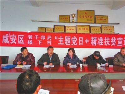 昨日,咸安区委老干部局和该区浮山办事处杨下村“两委”一起,在杨下村开展“主题党日+精准扶贫宣讲”活动。