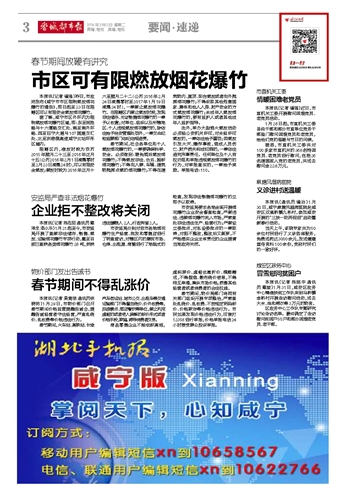 本报讯(记者 镇强)昨日,市政府发布《咸宁市市区限制燃放烟花爆竹的通告》,即日起至23日在限鞭区可以有限安全燃放烟花爆竹。