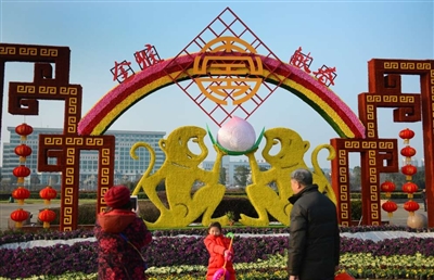 为了营造祥和的节日气氛,市园林局将金猴报春、金猴迎春、金猴献春、金猴贺春、金猴闹春五个主题的花卉景观布置于市区主要路口,同时还有近15万盆鲜花装扮香城。图为昨日,市民在市人民广场一处猴年味道的花卉景观前拍照留影。 赵忠志/摄