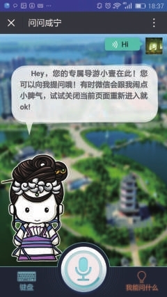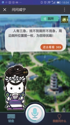想上厕所?别着急!也可以问呦!(语音输入)厕所——(小壹回复) 还有什么问题?小壹都会尽力为您解答哦。 暂时想不到问题,也没关系,可以看看右下角的“我能问什么”,关于咸宁旅游的各种问题,都可以在这里找到答案哦。 |