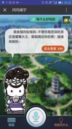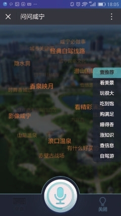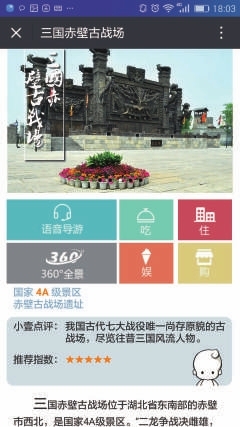 打开“咸宁闲游”——点击右下角“问问咸宁” 按住中间的语音输入键说:古战场,弹出(小壹回复)赫赫有名的赤壁大战,是以少胜多,以弱胜强的终极典范,您还不快来古战场遗址借东风! 在景区专属页面,语音导游、吃住娱购一站畅享!您可以看游览攻略,听双人对话语音讲解,还有精美的景区手绘地图,让你轻松玩景区! |
