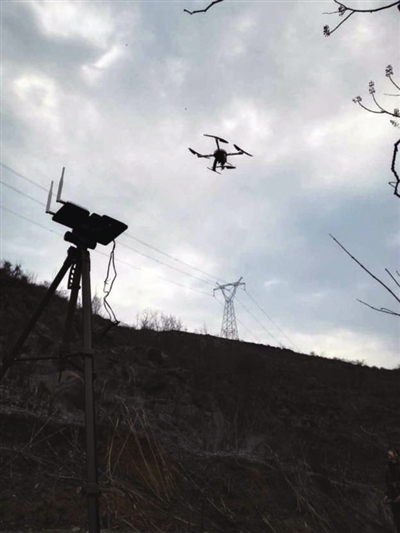 为准确掌握输电线路运行情况,确保供电保障到位,2月10日 、11日,咸宁供电公司启动无人机巡视山火地带输电线路。图为无人机在巡视地处咸安区桂花镇的500千伏咸梦线。