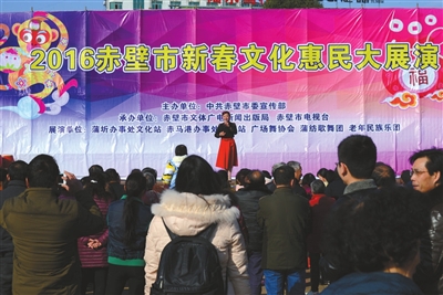昨日上午,赤壁市人民广场热闹非凡,由赤壁市委宣传部主办、赤壁市文广新局及赤壁市电视台承办的新春文化惠民大展演系列活动民俗专场演出吸引了近千市民赶来欣赏。