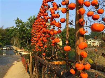 红岩村是广西有名的旅游村,春节装饰,村民不用灯笼,就地取材用起了柿子。在一些人家门前,村民故意不摘掉柿子,让它挂在枝头。在村里的河边,还可见一片片的柿子帘。