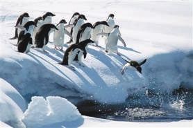 近年来,南极洲一处企鹅繁殖地附近一座巨型冰山坍塌,企鹅们不得不跋涉60公里到海里寻找食物,这导致了约15万只阿德利企鹅死亡。