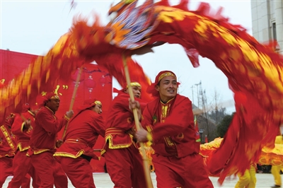 龙狮奔跑上台,腾、挪、穿、跃,时而匍匐,时而盘旋,一会儿双龙抢宝,一会儿二龙戏珠,变化多端,让人目不暇接。
