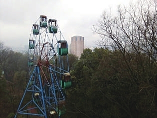 2月22日,记者来到香吾山公园。当天细雨朦朦,记者在公园里转悠了半天,没有见到一名游客。摩天轮、高空游览车、碰碰车等各种游乐设置锈迹斑斑,各式的门票房、小吃门面陈旧不堪,地上垃圾时见,偶有熄灭的火堆痕迹。