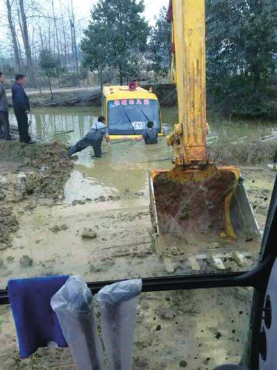 记者从网友发的现场照片中看到,一辆黄色校车在池塘中央不能动弹,已被池水淹没了半个车身(如图),最后被挖机救援上岸。