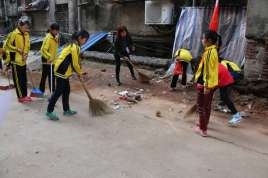 日前,该校少先队大队部干部和五年级学生一起带上清洁工具,在校长的带领下,对校园周边的街道进行清扫。